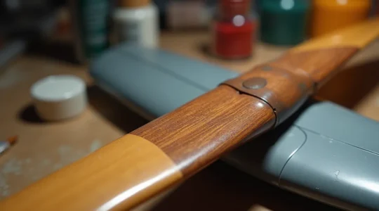 Specialized effects like wood grain simulation add authenticity to aircraft featuring exposed wood structures. The process involves base color selection (appropriate wood tone), oil paint dragging (pulling thinned oil paint across the surface with a fine brush to create grain lines), and masking to create individual plank delineation. A clear orange-tinted topcoat adds warmth and depth to the simulated wood.