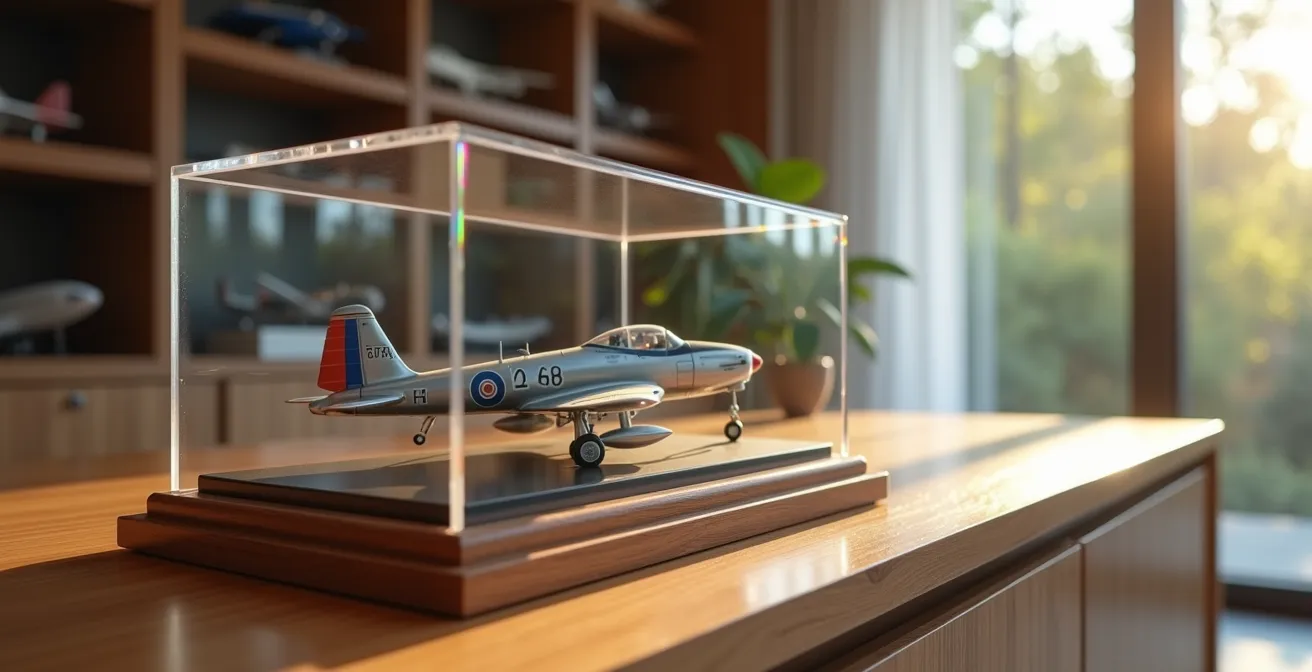 The common advice is to “keep models out of the sun” or simply “buy an acrylic case.” While well-intentioned, this counsel is insufficient for a serious collector. It fails to address the fundamental science of material decay. The true challenge isn’t just shielding a model, but actively preserving it. This requires a shift in mindset—from seeing a display case as a box to understanding it as a micro-environment. The key lies not in avoiding light, but in filtering it.
